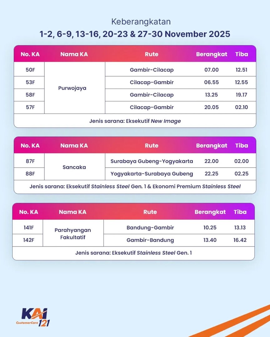 Sepanjang November, KAI mengoperasikan perjalanan tambahan harian untuk rute-rute strategis seperti Gambir-Surabaya Pasar Turi, Cilacap-Surabaya Pasar Turi, Ketapang-Malang, dan Malang-Surabaya Gubeng. Pada tanggal-tanggal tertentu, tersedia pula layanan untuk rute Gambir-Cilacap, Surabaya Gubeng-Yogyakarta, Bandung-Gambir, Semarang Poncol-Tegal, dan Solo Balapan-Gambir. Khusus untuk rute Cirebon-Gambir, perjalanan tambahan dijadwalkan setiap hari Minggu.