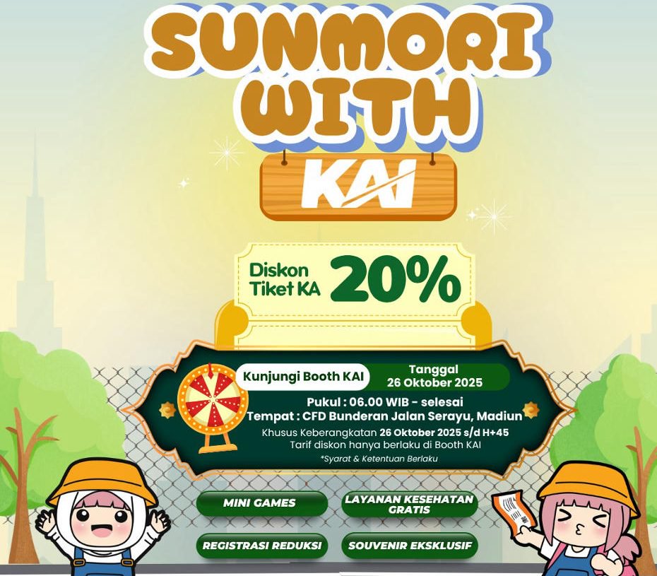 Madiun, 23 Oktober 2025 – Car Free Day (CFD) Bundaran Jalan Serayu Kota Madiun pada Minggu (26/10/2025) bakal lebih semarak dengan kehadiran PT Kereta Api Indonesia (Persero) Daerah Operasi 7 Madiun. KAI Daop 7 menawarkan beragam promo menarik, mulai dari diskon tiket kereta api sebesar 20 persen hingga mini games berhadiah dan layanan kesehatan gratis.