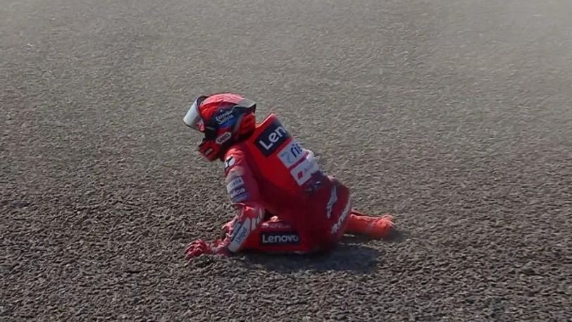Di tikungan ketujuh, motor Marc Marquez disundul dari belakang oleh Marco Bezzecchi. Tabrakan tak terhindarkan itu membuat Marquez terpelanting dan terseret ke gravel. Pembalap Ducati itu terlihat jelas menahan sakit sambil memegangi tangan kanannya setelah insiden tersebut.