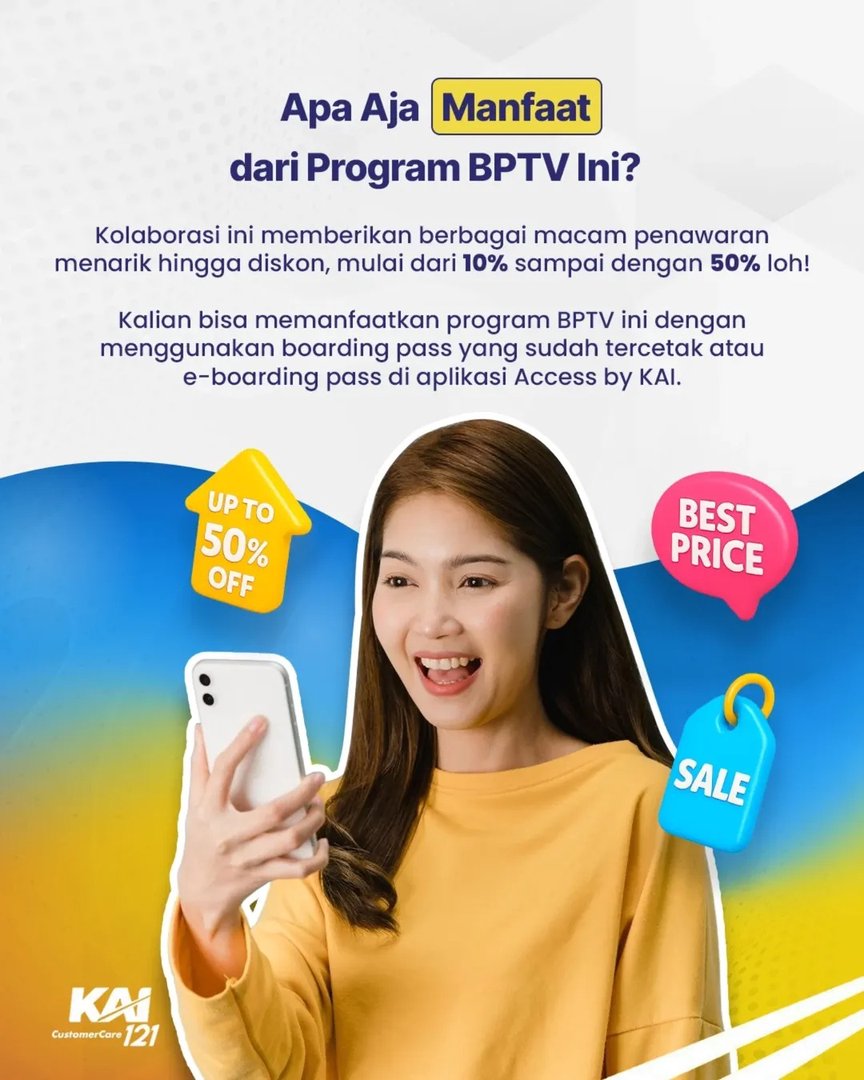 Program BPTV memungkinkan pelanggan memperoleh potongan harga hingga 50% di berbagai merchant pilihan, mulai dari hotel, restoran, tempat wisata, pusat perbelanjaan, hingga layanan kesehatan. Cukup dengan menunjukkan boarding pass fisik atau e-boarding pass melalui aplikasi Access by KAI, pelanggan bisa langsung mendapatkan diskon eksklusif dari mitra yang telah bekerja sama.