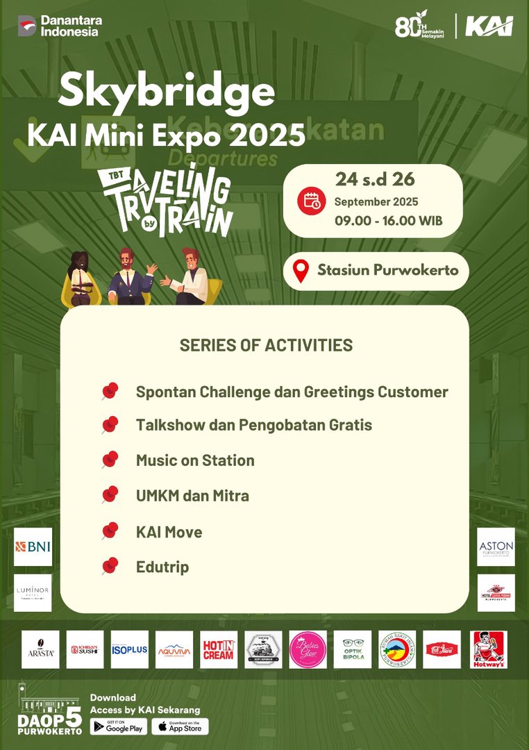 Purwokerto, 24 September 2025 – Stasiun Purwokerto menjadi pusat perhatian dengan digelarnya Skybridge KAI Mini Expo dalam rangka HUT ke-80 KAI. Acara ini memberi peluang besar bagi masyarakat untuk membeli tiket perjalanan kereta api dengan harga lebih hemat.